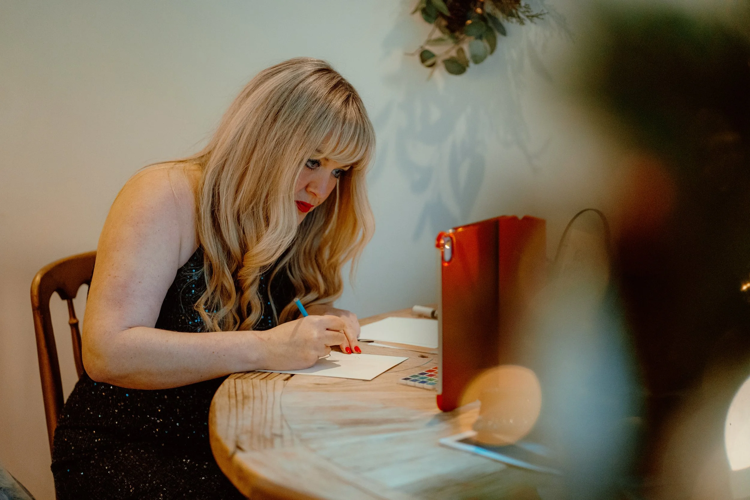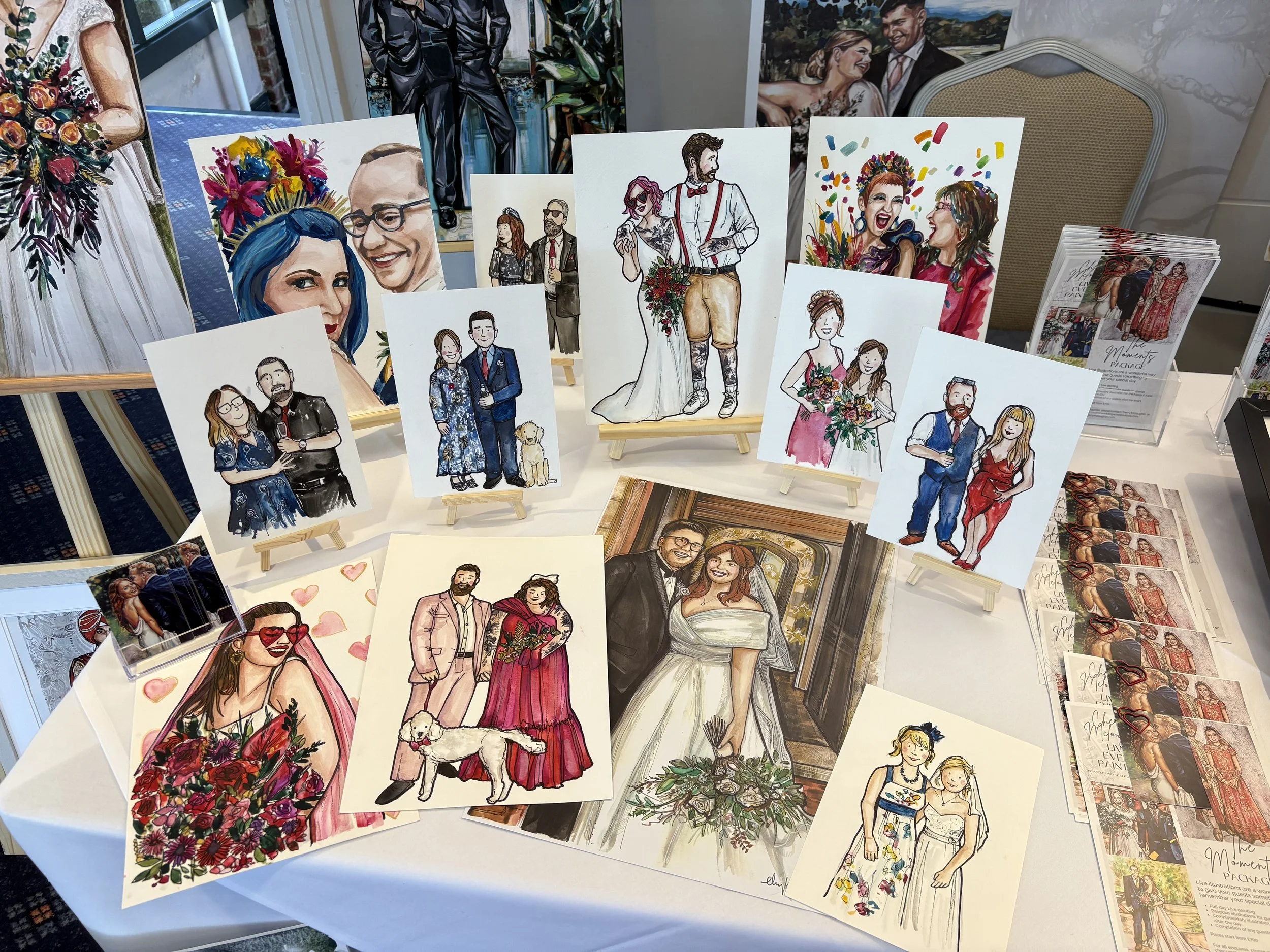 I will paint and illustrate your guests throughout the day, and love it when people come to see how the paintings are progressing